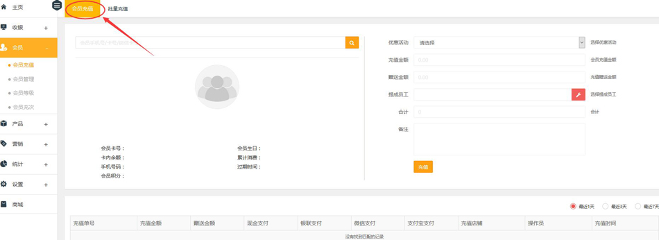 進(jìn)入會(huì)員儲(chǔ)值卡充值頁(yè)面,通過(guò)快捷搜索掃描輸入會(huì)員卡號(hào),一會(huì)員充值相應(yīng)的金額。該功能能夠收回成本做回籠資金所用。