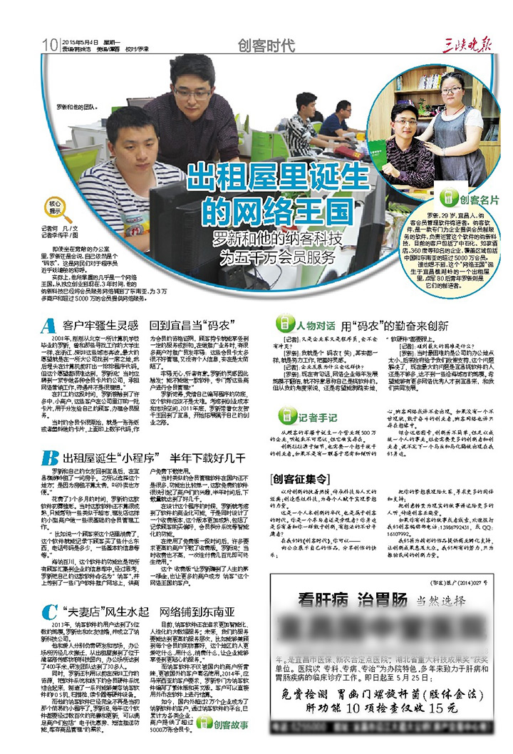 羅新,29歲,宜昌人,納客會(huì)員管理軟件締造者。納客軟件,是一款專(zhuān)門(mén)一企業(yè)提供會(huì)員制服務(wù)的軟件,負(fù)責(zé)運(yùn)營(yíng)這個(gè)軟件的納新科技,目前的客戶包括了中石化、如酒店、360度等知名的企業(yè),覆蓋區(qū)域包括中和東南亞的超過(guò)5000萬(wàn)會(huì)員。