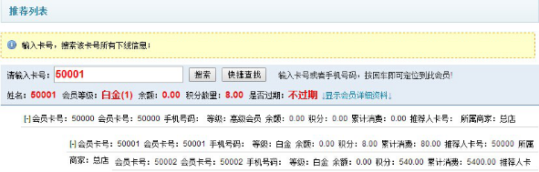 在我們會員軟件里面有八的會員推薦制度,現(xiàn)在一新的系統(tǒng)里可以查看并管理會員推薦的下線人員。有自己推薦人的記錄,和自己推薦下線的人員統(tǒng)計,包括積分,累計消費,手機(jī)號碼,會員等,推薦人卡號。