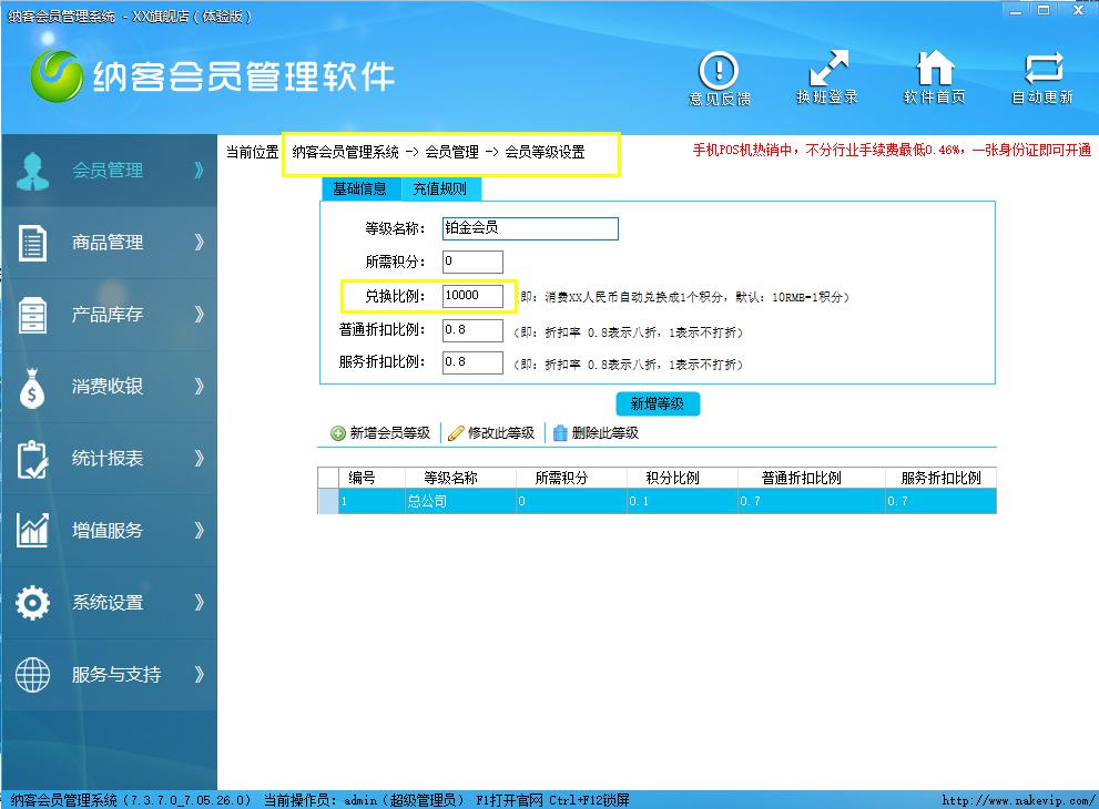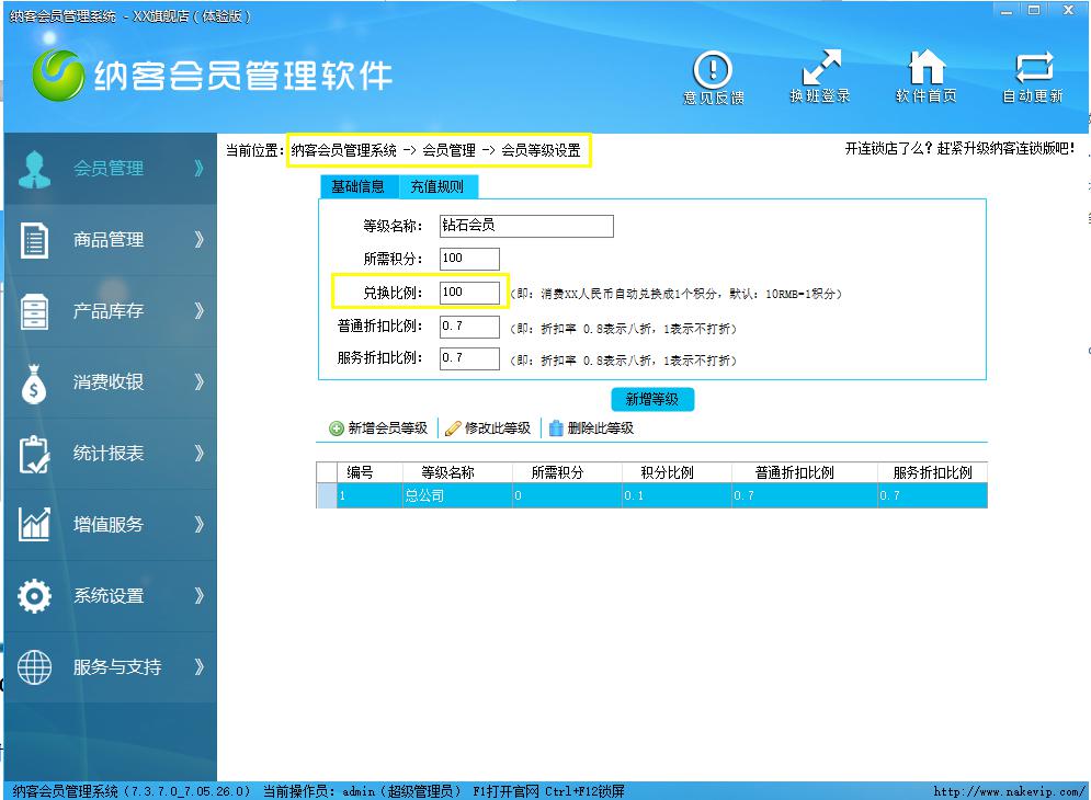 進(jìn)入會員管理模塊的會員等功能,然后在兌換比例處輸入100,完成等新增。然后在新增會員時選擇這個會員等,即可實(shí)現(xiàn)以上需求。