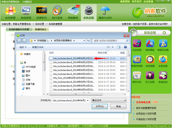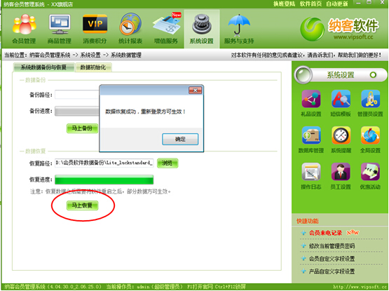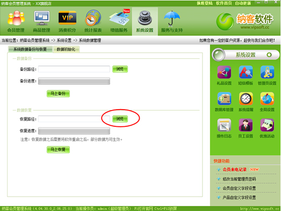 如果您要恢復(fù)數(shù)據(jù)的話,在我們納客會員管理軟件系統(tǒng)設(shè)置恢復(fù)路徑見上圖然后在文件夾里面選擇一后一個備份的數(shù)據(jù),這樣,您的所有數(shù)據(jù)就恢復(fù)到那個相應(yīng)的備份文件時間的數(shù)據(jù)了當(dāng)然,我們納客會員管理軟件在每次您退出的時候都會自動給您備份一個文件在備份的文件夾里面的,您要恢復(fù)的時候只需要點擊一后的時間。操作如上圖那樣,您的會員數(shù)據(jù)就永遠(yuǎn)不會丟失了。