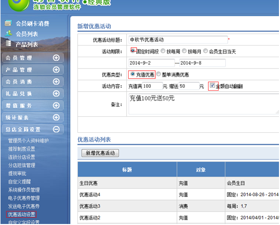 1. 充值優(yōu)惠:就是充值多少元,送多少元。例如中秋節(jié)馬上到了,店做中秋優(yōu)惠活動,充值滿100元送50元 。如圖: