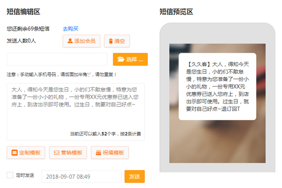 短信營銷是維系會員的重要途徑,活動信息、節(jié)日問候即時、定時送達(dá),喚醒沉睡會員,刺激用戶消費需求,這種方式切記操之過急、頻繁的使用,否則會帶來垃圾短信騷擾的影響。