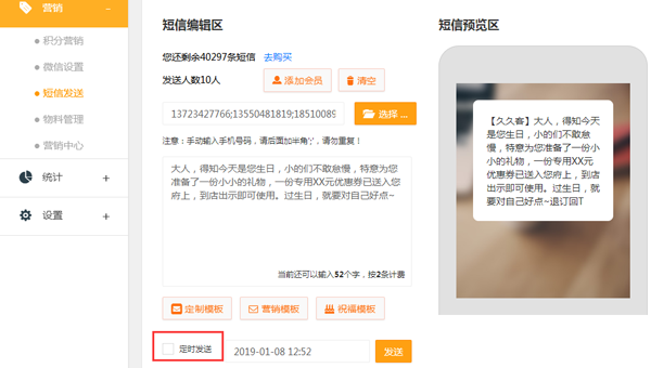商家還可以定時發(fā)送短信消息,比如在節(jié)假日即將來臨之際,預(yù)先設(shè)定好短信消息,在節(jié)日當(dāng)天就會自動群發(fā)設(shè)定好的短信內(nèi)容,大大的提高了管理人員的工作效率。