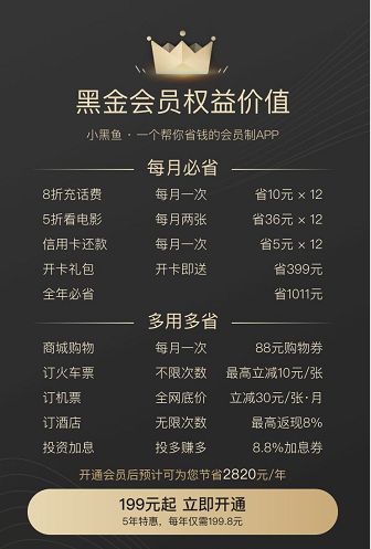 小黑魚(yú)黑金會(huì)員價(jià)格分別為半年199元,一年299元,五年999元。