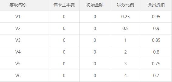 4,按步驟3的方式依次給V2-V6等級(jí)填入對(duì)應(yīng)的積分比例和折扣比例,填入后的圖如下