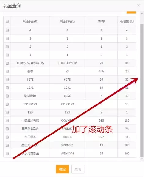 在【營銷】→【積分營銷】→【積分兌換】→【選擇兌換的禮品】→【禮品查詢】界面中,禮品種類原來只能顯示10種,優(yōu)化后加了滾動條,禮品種類可以完整顯示。