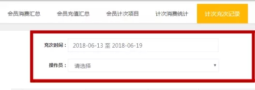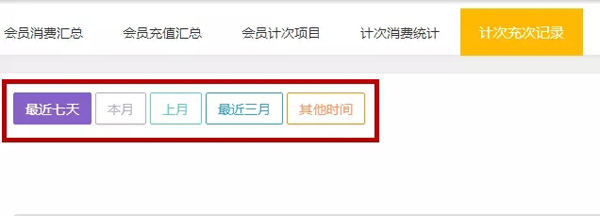 在【統(tǒng)計】→【統(tǒng)計分析】→【計次充次記錄】中,之前時間選擇項有一近七天、本月、上月、一近三月、其他時間五個類別,優(yōu)化后可以自主根據(jù)起始日期來查找。