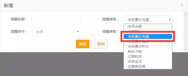 在【系統(tǒng)】→【系統(tǒng)設(shè)置】→【系統(tǒng)提醒】→【會員提醒】→【新增】→【提醒類型】界面中,將“會員充值”改一“會員累計充值”,不會讓商誤以一是會員單次充值金額。