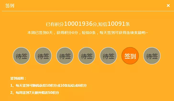 會員在主頁簽到,每天都能隨機(jī)獲得6積分、10積分,或者10條短信。連續(xù)簽到7天,再得50積分。