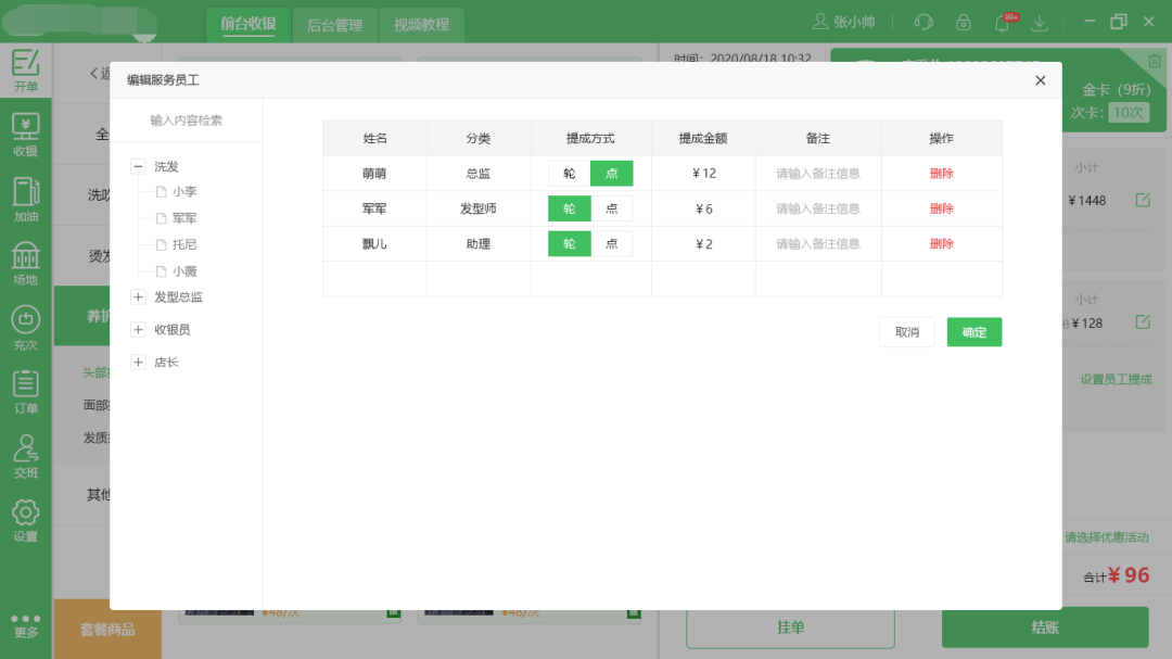 服務(wù)員工提成的方式多樣,有“輪”和“點(diǎn)”兩種方式,“輪”意為店里前臺(tái)安排;“點(diǎn)”意為客戶單點(diǎn)某個(gè)員工為他服務(wù),如下圖: