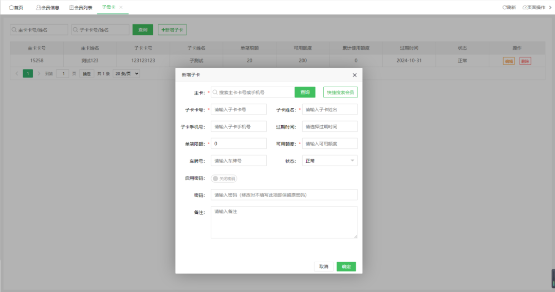 加油站版本新增子母卡功能,在后臺(tái)統(tǒng)一添加管理,如下圖所示: