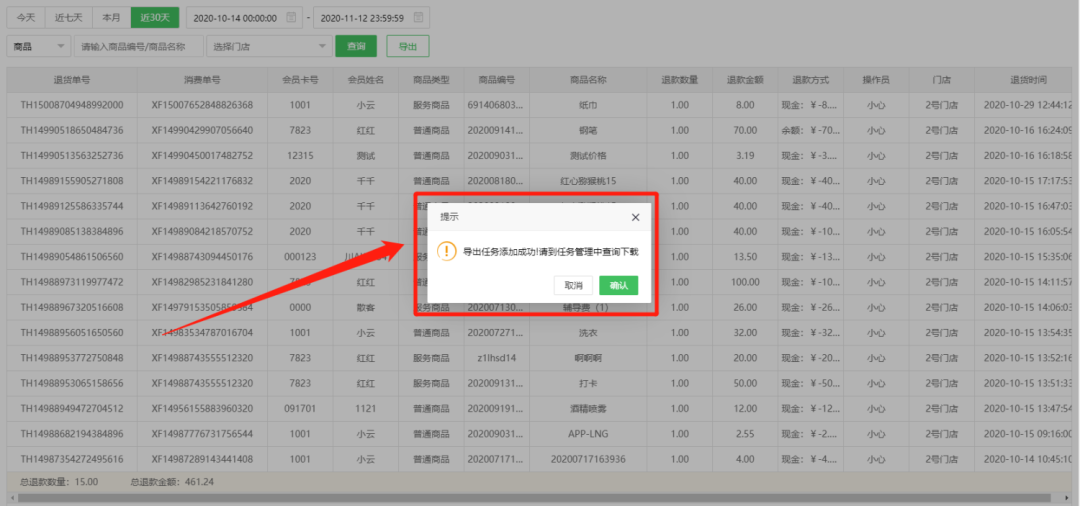 在各報(bào)表中點(diǎn)擊【導(dǎo)出】按鈕后,彈窗提示“導(dǎo)出任務(wù)添加成功!請(qǐng)到任務(wù)管理中查詢下載!”如下圖所示: