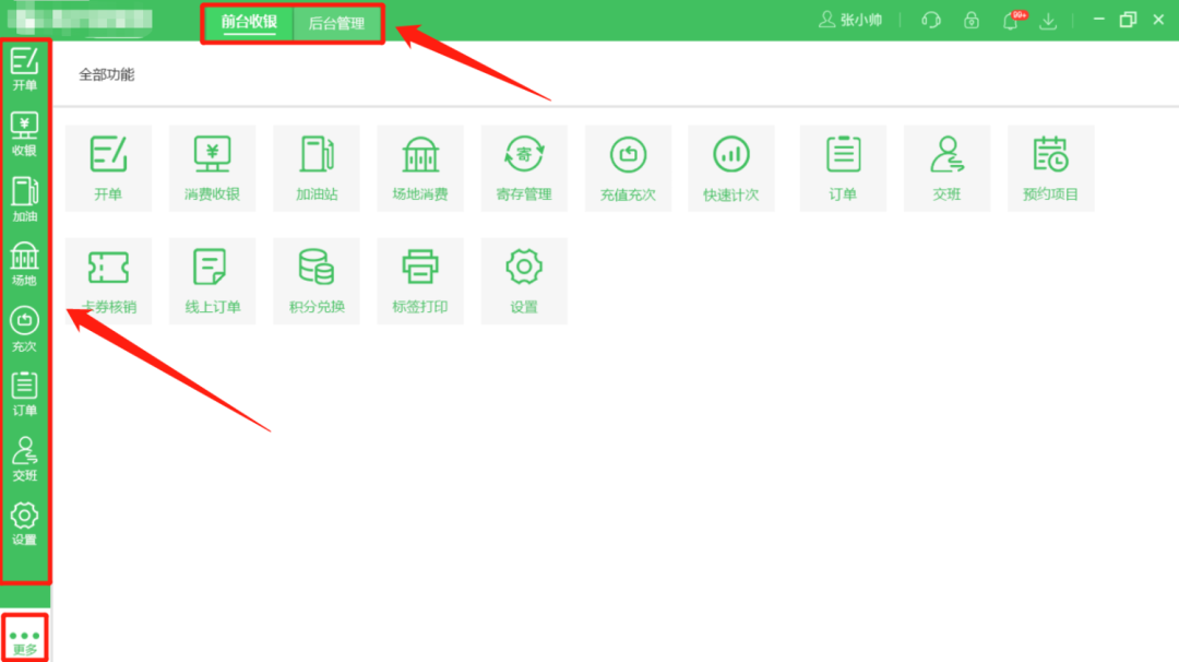 優(yōu)化后,前后臺(tái)切換按鈕在左上部位置 ;菜單在最左側(cè),全部菜單功能通過點(diǎn)擊左下角【更多】按鈕展示。如下圖所示: