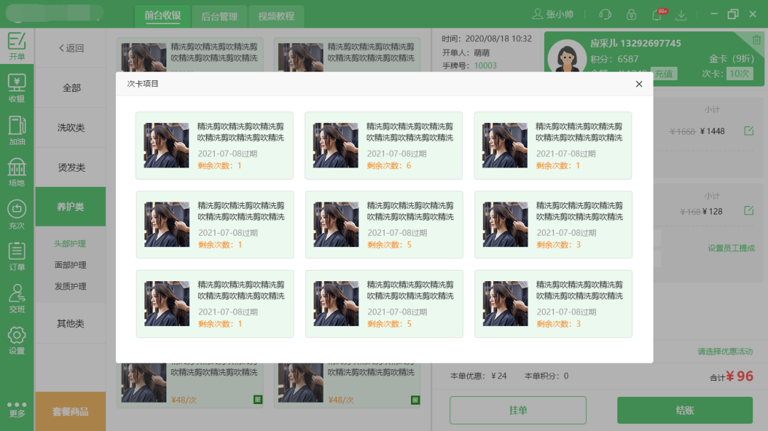 開單時(shí),查詢到會(huì)員信息后,點(diǎn)擊次卡次數(shù)即可顯示該會(huì)員名下所有的次卡項(xiàng)目,點(diǎn)擊可直接消費(fèi)。