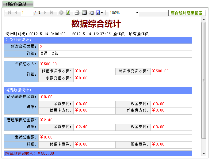 點擊“統(tǒng)計報表”主菜單,然后選擇“綜合”子菜單,即可調(diào)出綜合統(tǒng)計報表窗口,如下圖: