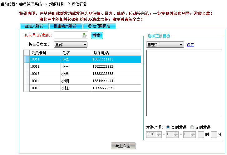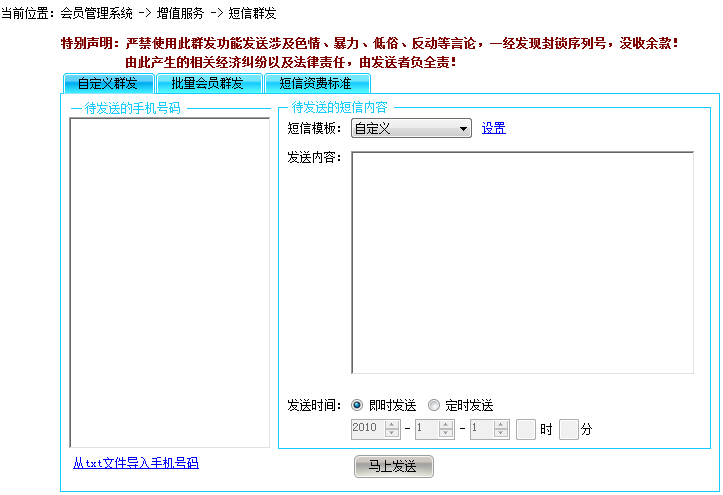 分一“自定義群發(fā)”和“批量會(huì)員群發(fā)兩種”,自定義群發(fā)可以自由輸入手機(jī)號(hào)碼,可以向任意手機(jī)號(hào)碼發(fā)送,一次200個(gè)以內(nèi);