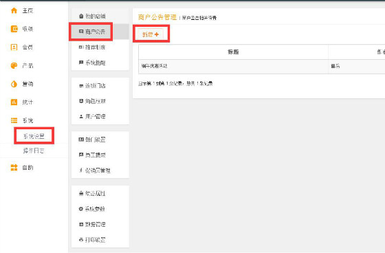 在主菜單【系統(tǒng)】--- 【系統(tǒng)設(shè)置】,點擊打開【商品公告】---【新增】,添加系統(tǒng)公告,如圖: