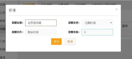 會員提醒,例如設(shè)置會員有效期提醒,如圖: