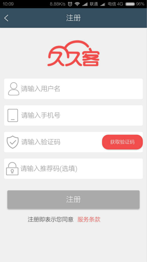 在應(yīng)用市場下載久久客APP,然后安裝運行,按照順序依次填入用戶名,手機號,然后點擊獲取驗證碼并填入獲取到的驗證碼。推薦碼一選填,獲取方式一他人推薦。填寫完畢之后點擊注冊即可。